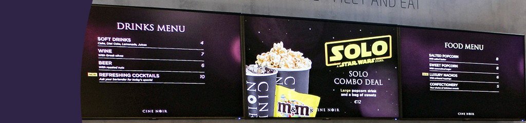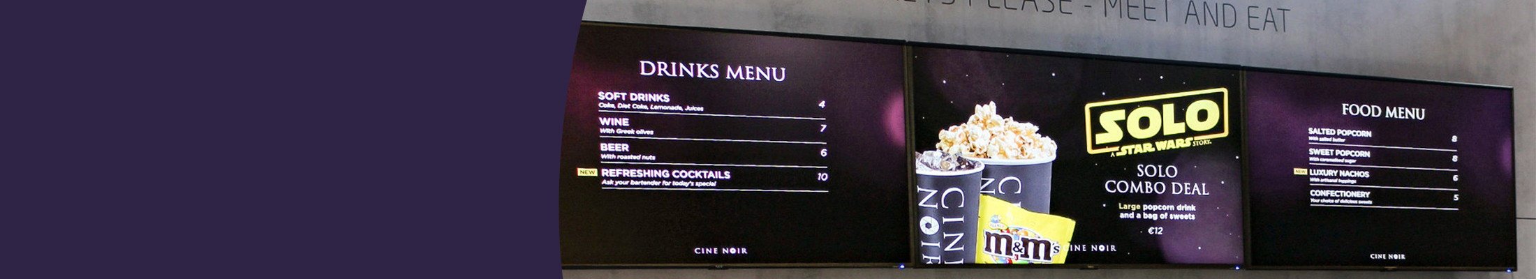 Whether an on-line pre-order, a self-service kiosk or via box office staff, giving your customers choice ensures you are providing top class customer service to suit all references whilst streamlining order processing. Visual communications and customer interfaces bring more opportunities for customer engagement with promotions to upsell and cross sell. The digital menu board is the visual centerpiece - from show previews, concessions menus and themed promotions, this vital communication with your guests imparts information whilst building anticipation. By linking with on-line booking systems, the communication is intensified, with personalized and highly relevant content. The superb flexibility of CINE NOIR ensures customer interfaces and content delivery are perfectly aligned to your audiences at any time of the day or night, presenting your customers with intelligently tailored choices.