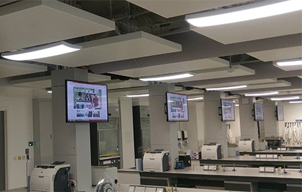 In the science labs, NEC 46” V463 displays are installed at the end of every bench, controlled by IP. “We have found NEC displays to be very reliable having worked with the brand for several years. The specification of the screens fell within the usage parameters for the lab spaces and are now delivering bright HD content, easily readable in the sun lit lab spaces,” says Adam Harvey.