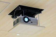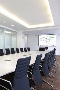 One of the first challenges was the planned training room for the Europäische Reiseversicherung (ERV) in Building 1 at Kustermann Park. Here, a chilled ceiling, which is almost completely criss-crossed by water pipes, provides a pleasant atmospheric environment. At the same time however, the pipes prevent the planned projector from being fitted in the middle of the room, as it is not allowed to drill the ceiling at this point. The solution is provided by the NEC NP3250 with its enormous flexibility. The unit was mounted offset, but still provides distortion-free projection thanks to the Lens-Shift and 3D-Reform functions. An example of the importance of partner know-how is shown by the boardroom of the Kustermann Park tenant, ERV. The ceiling in this room is too low to fit a projector without obscuring vision. Heinemann has therefore implemented a customised rear-projection system in this location. The entire hardware is hidden behind a wall at the head end of the room which also accommodates a projection surface. The central point of the installation is an NEC NP3250 projector with special wide-angle lens. Its light beam is directed onto the screen from behind by means of an accurately mounted mirror. As well as the invisible equipment, this solution also provides a higher contrast than conventional projections.