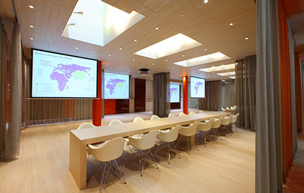 The media technologies sub-project was the heart of the infrastructure modernisation, and ran from January 2010 until the reopening on 3rd May. Responsible for the selection and installation of the equipment was Claus Heinemann Elektroanlagen GmbH. In spite of the time pressure, the customer’s demanding technical requirements had to be fulfilled. The networking capability of the displays and projectors and, in particular, the ability to control them remotely using RS232 code played a central role in the selection of the equipment. Because of this, the user does not have to interact directly with the units. Instead, he works with a specially programmed Crestron media control system. This user-friendly remote controller provides all the control commands the user needs on a touchpad. Giuseppe Irmici, Project Manager for Media Technology at Heinemann, also cites the outstanding quality of all NEC units as the crucial argument in the choice of manufacturer: “Performance and reliability are particularly important for business use. For instance, failures can result in substantial consequential costs if a training course or presentation cannot be carried out as planned”, he explains. “As a rule, the equipment is responsible for only five to ten percent of the project costs. You shouldn’t spoil the ship for a ha’porth of tar.”